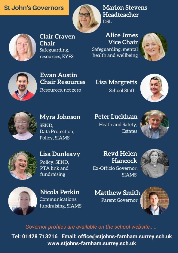 At St John’s our governors are nominated by the Diocese of Guildford, the local PCC, teaching staff and parents. They serve a term of four years, although they can continue for subsequent terms. It is a voluntary role and we endeavour to recruit volunteers with skills that will enable the school to achieve its priority targets.