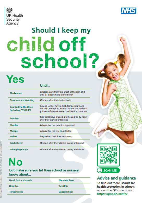 The Health Protection Agency provides guidelines on Infection Control in Schools and other Child Care Settings for common childhood illnesses.